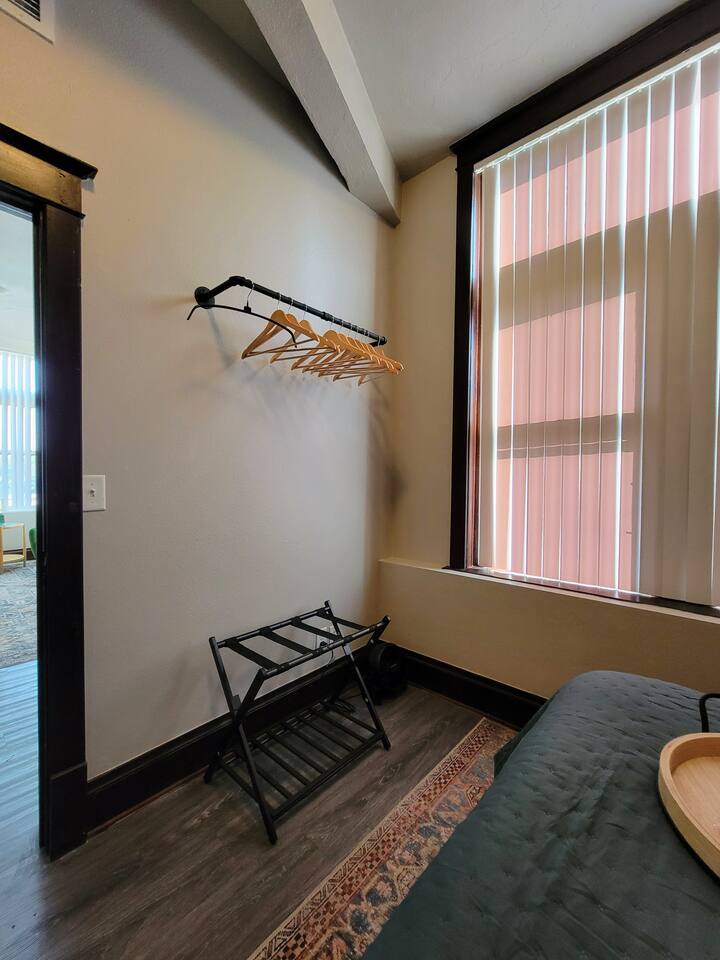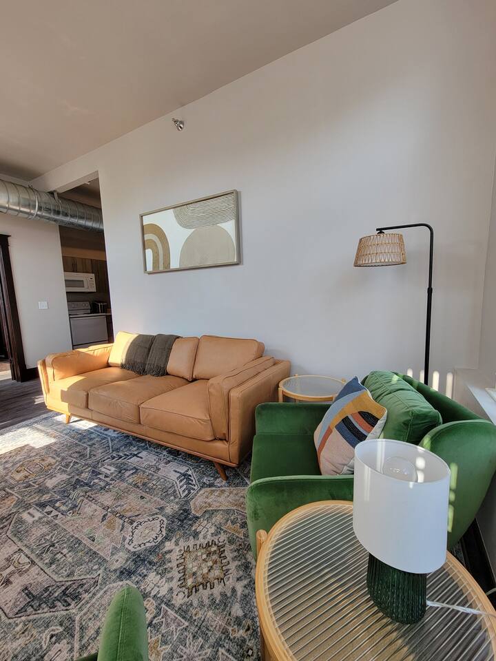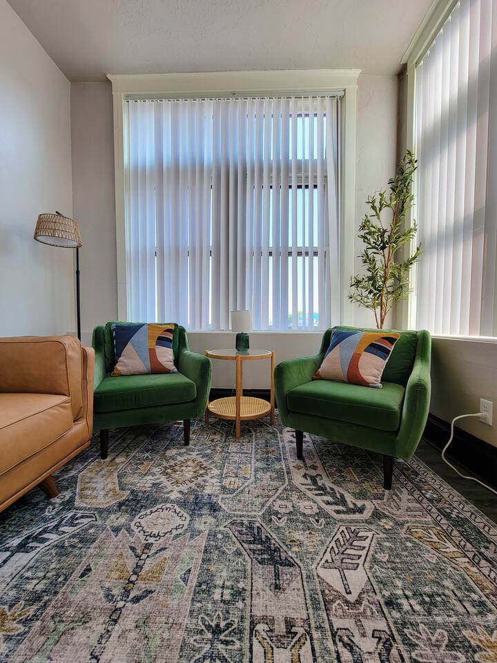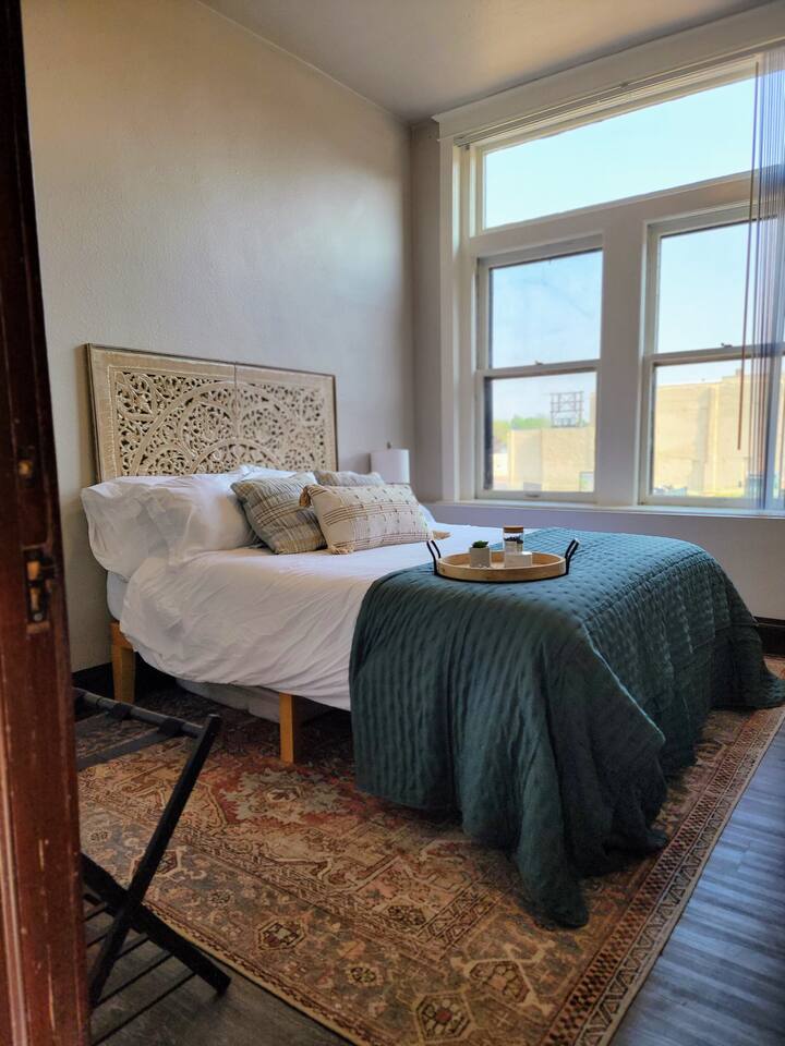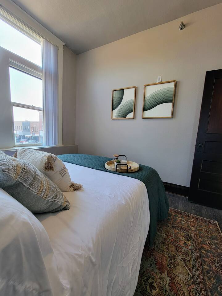 Stay in our historic corner-apartment nestled in a downtown building in Mitchell, SD, once the headquarters for George McGovern's presidential campaign! Location: Situated in the heart of downtown, steps away the iconic Corn Palace, local restaurants, bars, and unique shops. Accommodation: Inviting atmosphere featuring two bedrooms with plush queen-sized beds and one bathroom. Amenities: Free parking, WiFi, TV with complimentary Netflix, fully equipped kitchen, hairdryer, fitness room.